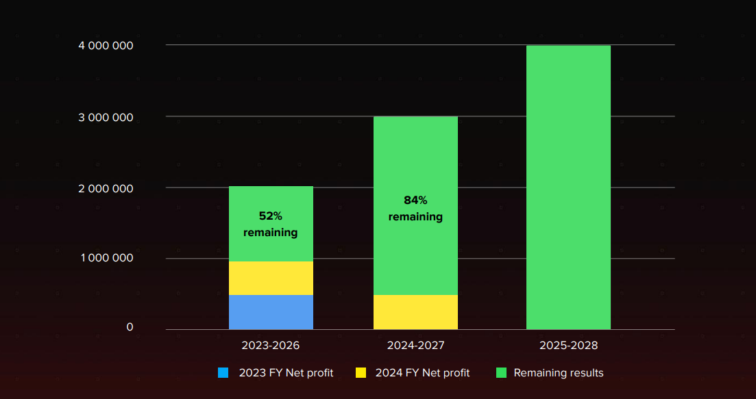 Brak premiery Wiedźmina 4 do końca 2026 r. rodzi pytanie o realizację programu motywacyjnego. Przypomnijmy, że zgodnie z jego zapisami, zarząd otrzyma dodatkowe akcje, gdy zysk netto w latach 2023-2026 wyniesie łącznie 2 mld zł, a procentowa zmiana kursu akcji CD Projektu będzie większa lub równa zmianie indeksu WIG z poprzedniego roku powiększonej o 10 pkt proc. Specjaliści są zdania, że choć firma pracuje nad więcej niż jednym niezapowiedzianym projektem, to nie zrewolucjonizują one wyników w tym okresie.
