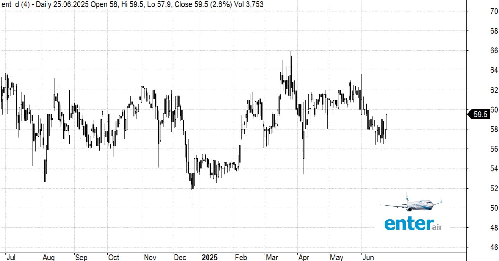 13 czerwca rozpoczęła się wojna między Izraelem a Iranem. W obliczu tych doniesień cena baryłki ropy WTI wystrzeliła w górę z poziomu około 68 dolarów do ponad 74 dolarów. Choć aktualnie jest ona niższa niż przed wybuchem konfliktu, to sytuacja w regionie pozostaje napięta. Co ciekawe, Enter Air nie powinno odczuć podwyżki cen paliw lotniczych ze względu na charakter swojej działalności.