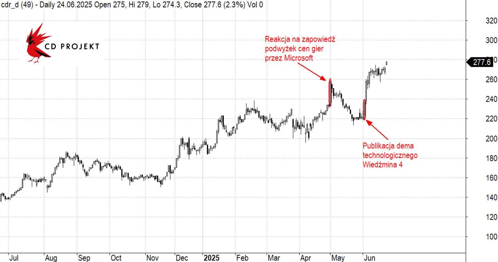 „Niedawno zobaczyliśmy technologiczne demo Wiedźmina 4. Pozwala to sądzić, że choć premiera nastąpi po 2026 r., to spółka może mieć sporo asów w rękawie i budować zainteresowanie tytułem. Oprócz tego ogłoszono, że CD Projekt pracuje także nad trzema nieogłoszonymi projektami, w tym dwoma growymi, na które wydatki są już kapitalizowane. Pokazuje to, że do 2027 r. spółka może nas jeszcze zaskoczyć następnymi informacjami” komentowała wówczas dla Strefy Inwestorów analityczka Wood&Company Maria Mickiewicz.
