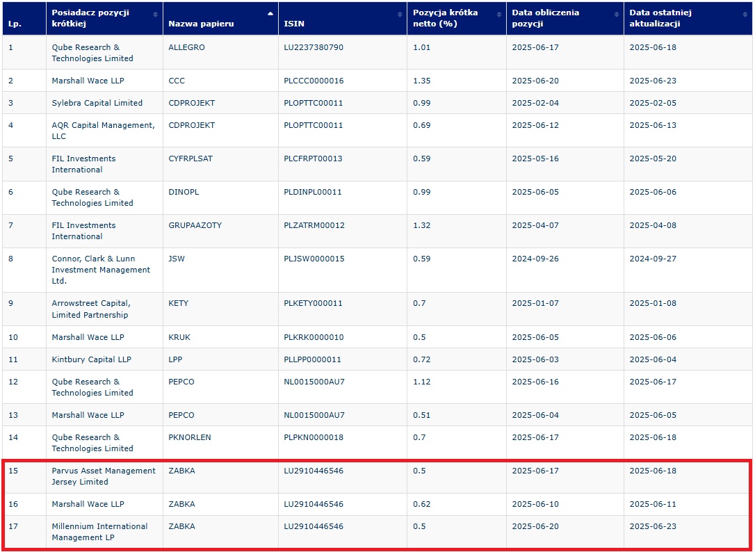 We wtorek po południu w rejestrze krótkich pozycji KNF aż trzy dotyczyły akcji Żabki, a po dwie transakcje związane były z walorami CD Projektu oraz Pepco. Warto zauważyć, że rejestr uwzględnia jedynie pozycje przekraczające swoją wielkością 0,5% akcji firmy. Tym samym pod progiem widoczności może być ich więcej.