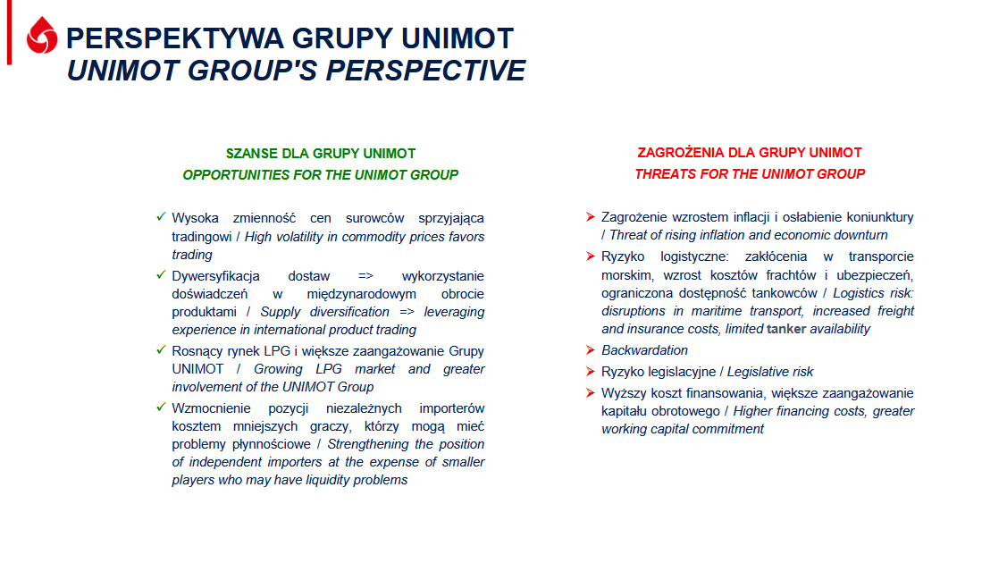 Dodatkowymi czynnikami, na które narażona jest działalność Unimotu w takich warunkach, są wyższe koszty finansowania, potrzeba większego angażowania kapitału obrotowego oraz potencjalne spowolnienie gospodarcze wynikające z wyższej inflacji.