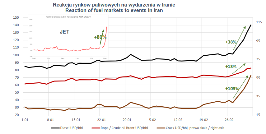 Podstawowym czynnikiem ryzyka na rynku pozostają zakłócenia w transporcie morskim, co przekłada się na wzrost kosztów frachtu oraz problemy z dostępnością tankowców. Przez Cieśninę Ormuz przechodzi 90% eksportu ropy z Arabii Saudyjskiej, Kuwejtu i Kataru, a zablokowana część mocy produkcyjnych rafinerii na Bliskim Wschodzie (odpowiadająca za 10%-12% tamtejszego potencjału) silnie oddziałuje na łańcuchy dostaw. Mimo że większość tego surowca trafia do Azji, europejscy importerzy również odczuwają presję.