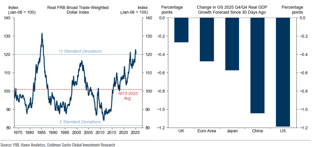 Zgodnie z prognozami ekonomistów Goldmana Sachsa, w ciągu najbliższych 12 miesięcy prawdopodobieństwo recesji w USA sięga 45%. Co więcej, z powodu wojny celnej, zmienili oni prognozy dotyczące wzrostu PKB od IV kw. 2024 r. do IV kw. 2025 r. Jak widać, największa rewizja dotyczy przede wszystkim USA oraz Chin.