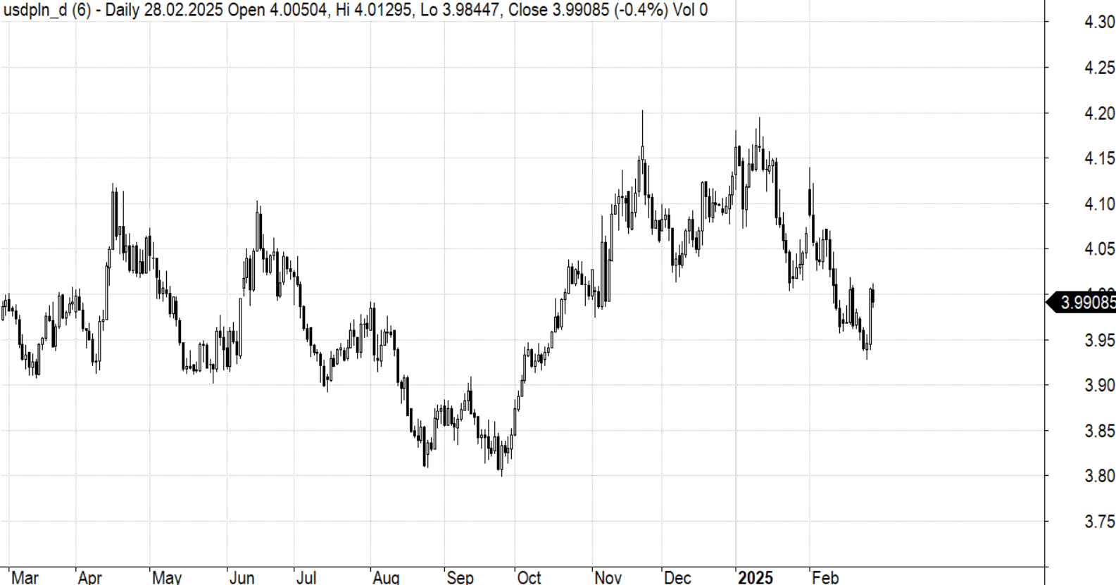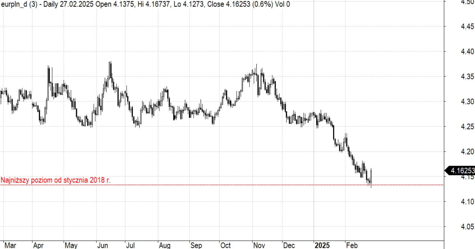 Wsparciem są także dane spływające z rodzimej gospodarki. Styczniowe informacje dotyczące sprzedaży detalicznej w Polsce znacząco przebiły prognozy ekonomistów. Przypomnijmy, że wskaźnik podskoczył w cenach stałych o 4,8%, podczas gdy spodziewano się wyniku na poziomie 1,5%. Wspomniane minima z 2018 r., na poziomie około 4,13 zł, z technicznego punktu widzenia będą trudne do pokonania.