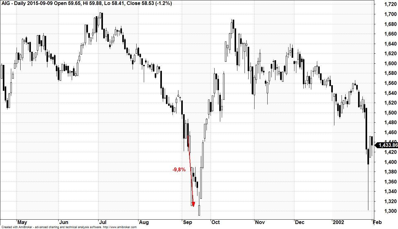 Notowania AIG (Wykres 2), największej amerykańskiej firmy ubezpieczeniowej, otworzyły się na pierwszej sesji po atakach prawie 10% niżej. Kurs akcji bardzo szybko jednak odzyskiwał straty i jeszcze do końca miesiąca odrobił je w całości.