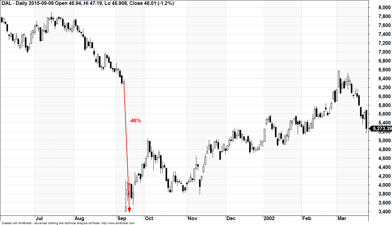 Dużo większe straty odnotowała jednak branża lotnicza. Przykładowo, kurs akcji Delta Airlines (Wykres 3) otworzył się na pierwszej sesji po atakach 46% niżej. Powrócił do poziomu sprzed 11 września 2001 dopiero w marcu 2002.
