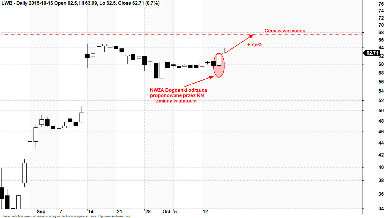 - NWZA Bogdanki musi odrzucić rekomendowane przez RN spółki zmiany w statucie. To nastąpiło 15 października 2015 r. Warto jednak zauważyć, że w NWZA spółki reprezentowane było 67,8% kapitału akcyjnego spółki. To oznacza, że najwięksi akcjonariusze Bogdanki, czyli OFE tłumnie stawiły się na tym walnym. To może stanowić pewien sygnał, że są zainteresowane wzięciem udziału w wezwaniu.