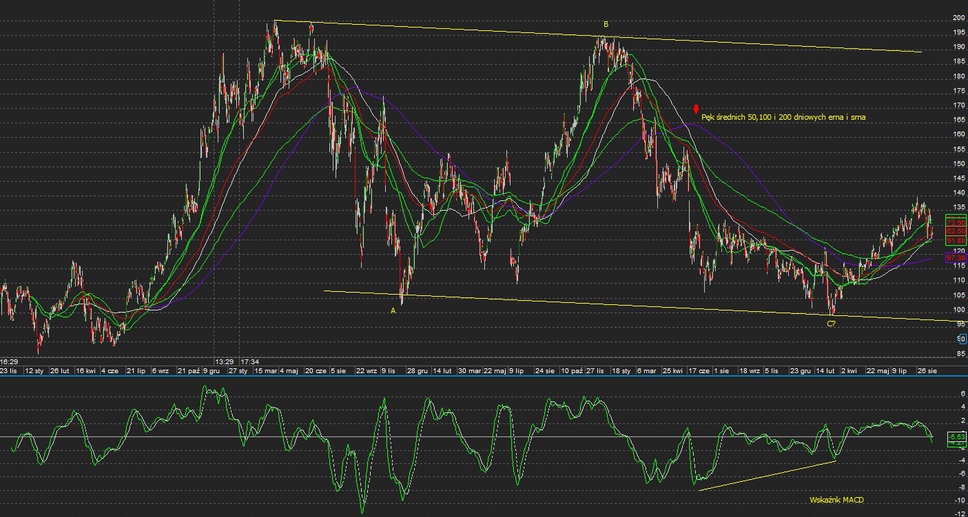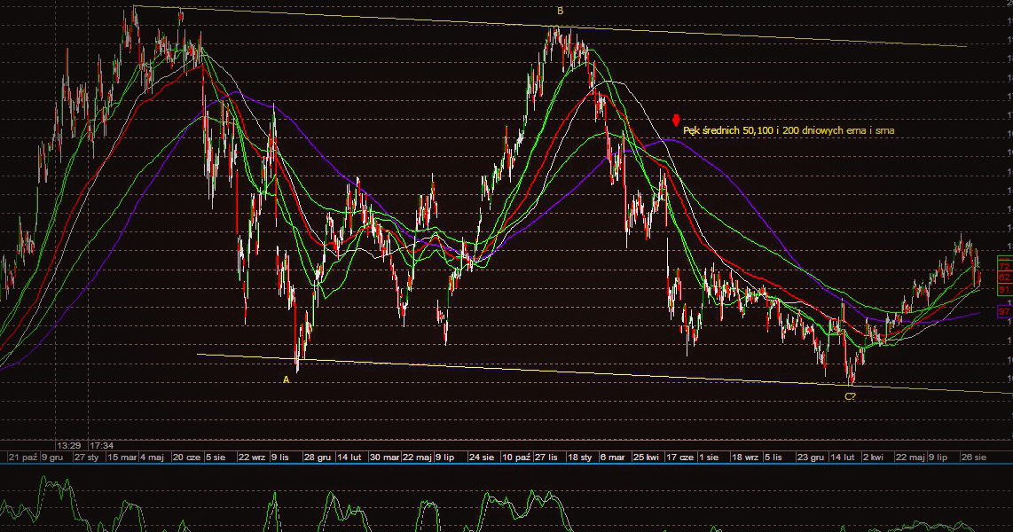 W pierwszym przykładzie mamy wykres spółki KGHM w układzie dziennym. Została na nim przedstawiona duża korekta ABC, jaka tworzyła się przez prawie trzy lata. Była ona konsekwencją wcześniejszego wieloletniego trendu wzrostowego, jaki panował na spółce. Przebieg korekty w równoległym kanale spadkowym, równość fal A i C (metoda Over Balance) oraz dywergencja, jaka powstała na wskaźniku MACD, pozwoliła mi na zajęcie pozycji (kupno) bardzo blisko lutowego dołka, a zamknięcie nastąpiło dopiero pod koniec sierpnia, gdy spółka zaczęła wykazywać oznaki słabości i przebijać średnie kroczące od góry.
