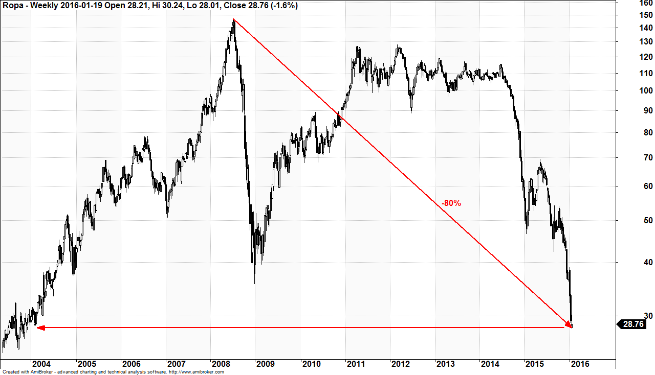 Jednym z surowców, który ma największy udział w CRB Index jest ropa naftowa. Cena tego surowca znajduje się obecnie 80% poniżej swoich maksimów z 2008 roku. Ostatni raz po takiej cenie baryłka ropy była notowana w 2002 roku.