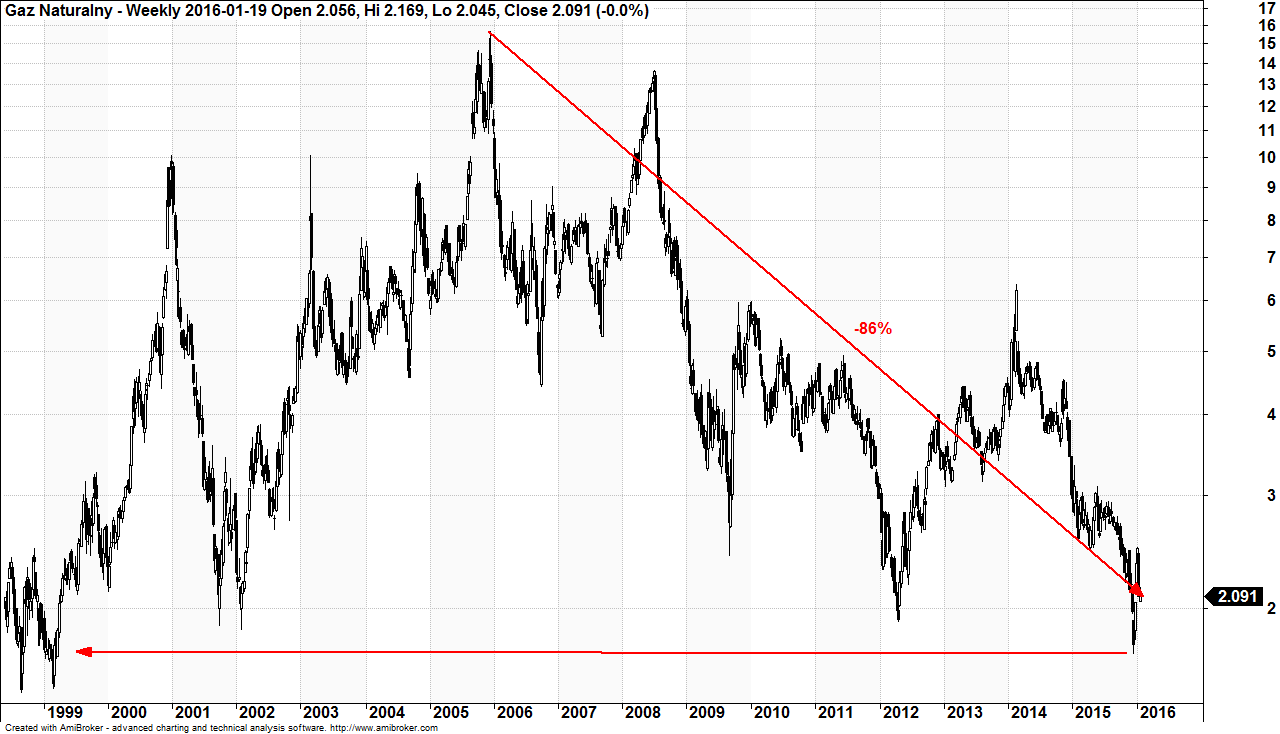 Rewolucja łupkowa odcisnęła silne piętno na cenach gazu. Obecnie gaz naturalny jest notowany 86% poniżej maksimów z 2005 roku. W styczniu, co prawda notowania trochę odreagowały, ale jeszcze w grudniu znajdowały się na najniższych poziomach od 1999 roku.