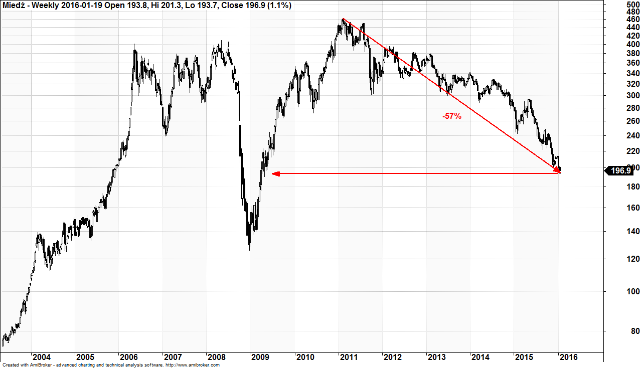 Nieco mniejszej skali przeceny doznały metale. Notowania miedzi znajdują się obecnie na najniższych poziomach od 2009 roku, a od szczytu z 2011 roku spadły 57%.