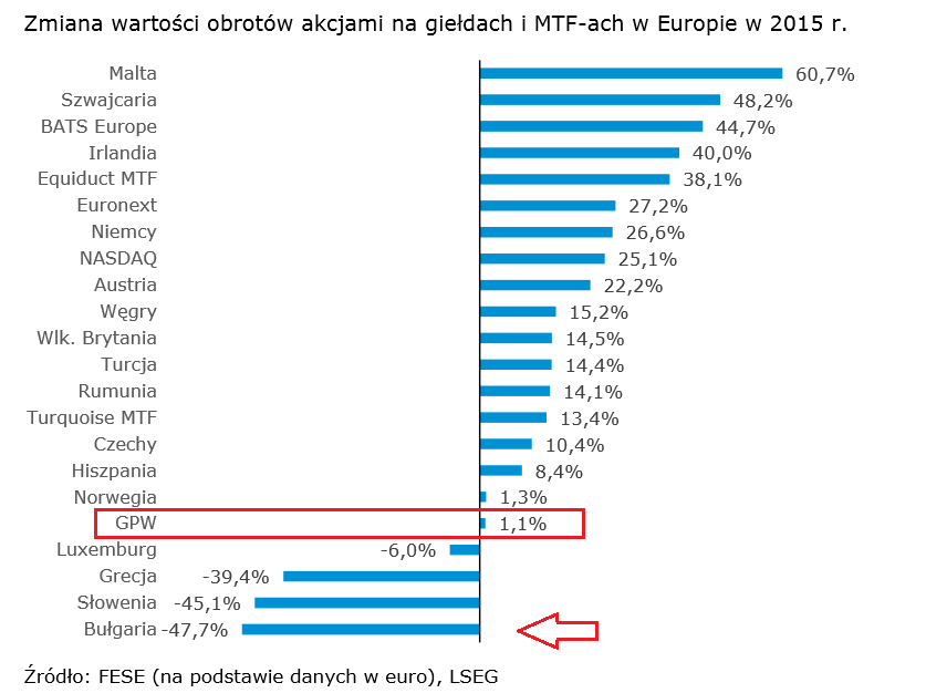 To niestety jest zły wynik. W Europie gorsze zmiany obrotów niż GPW odnotował tylko Luxemburg, Grecja, Słowenia i Bułgaria. Obroty na giełdzie w ościennych Czechach wzrosły o 10%, a w Rumunii o 14%. Węgry odnotowały wzrost obrotów o ponad 15%.