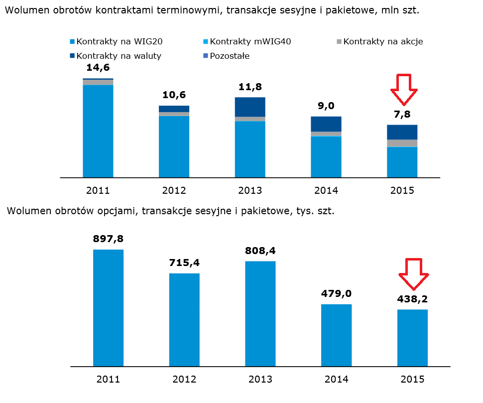 Obrót zarówno opcjami jak i kontraktami terminowymi spada. Jedynym rozwijającym się produktem gdzie widać wzrost obrotów są kontrakty na akcje.