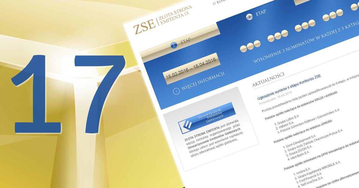 Znamy już listę spółek, którym najbardziej zależy na budowaniu dobrych relacji z inwestorami w internecie. Do trzeciego etapu konkursu Złota Strona Emitenta IX, organizowanego przez Stowarzyszenie Emitentów Giełdowych zakwalifikowano 17 spółek. W gronie najlepszych znalazły się spółki z indeksów WIG20, mWIG40, sWIG80 ale też i NewConnect.