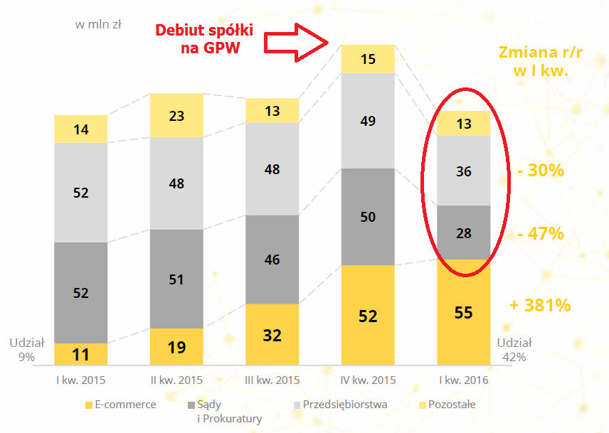 To już jest jednak przeszłość, ponieważ w pierwszym pełnym kwartale wyników po debiucie spółka notuje ich drastyczne pogorszenie i pierwszą stratę w swojej historii. W obliczu problemów ze wzrostem segmentu e-commerce i spadku obrotów z segmentu listów, ten obraz może się utrzymać dłużej, a spółka ma bardzo małe szanse na odbudowanie swojej pozycji przychodowej do poziomu z końca 2015 roku.