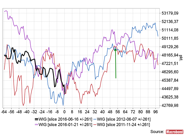 Czy te na pierwszy rzut oka sprzeczne wnioski da się jakoś pogodzić? Myślę, że tak. I 10 miesięcy temu i 5 miesięcy temu w poprzednich dołkach cyklu 20-tygodniowego. WIG nie potwierdzał już wtórnego dołka DAX-a. Innymi słowy wtórne minima WIG-u we wrześniu i w lutym wypadały już na wyższym poziomie niż dołki pierwotne z sierpnia i stycznia. Myślę, że i obecnie powtórka tego schematu jest prawdopodobna, co oznaczałoby, że WIG właśnie robi dołek, którego nie pobije w lipcu natomiast na ostatecznie minimum DAX-a możemy rzeczywiście poczekać do połowy przyszłego miesiąca. Oczywiście istotny wpływ na zachowanie rynków będą miały wydarzenia w Wielkiej Brytanii, ale o tym w następnym wpisie.