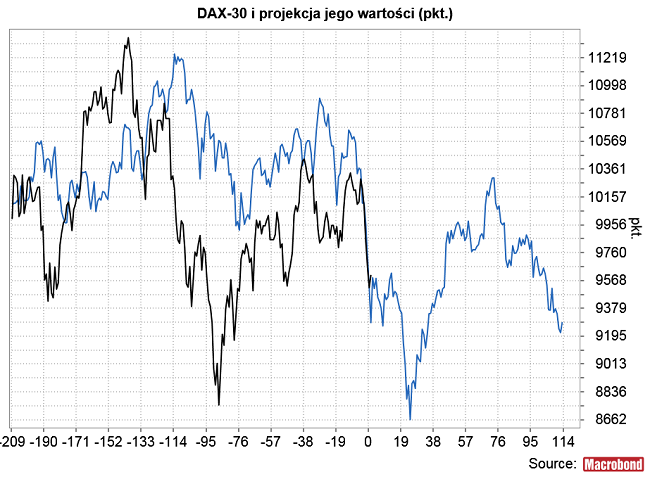 Projekcja dla DAX-a uzyskana przez uśrednienie ścieżek indeksu wokół podobnych do wtorkowego sygnałów ze stycznia i sierpnia robi dołek dopiero w okolicach 18 lipca.
