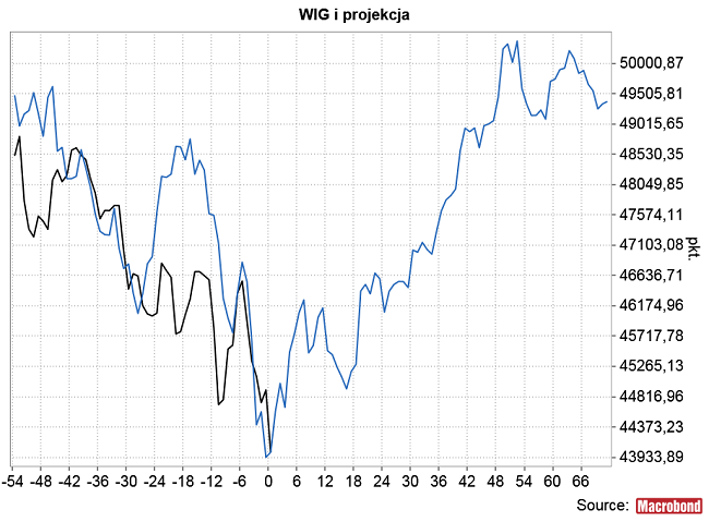 Tymczasem projekcja wartości WIG-u uzyskana na podstawie 3 opisanych powyżej sygnałów INI robi dołek od razu i rośnie o niecałe 15 proc.