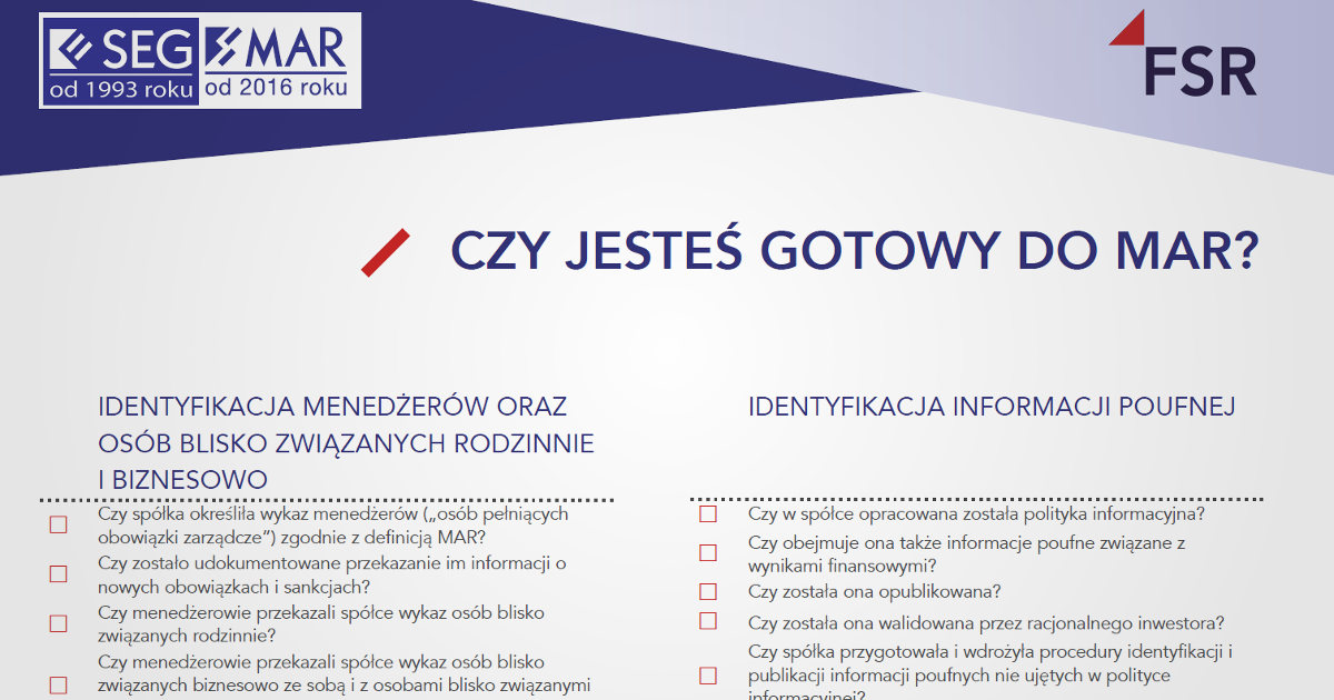 Już w najbliższą niedzielę zaczyna obowiązywać Market Abuse Regulation (MAR), która zmienia dotychczasowe zasady raportowania spółek giełdowych. Stowarzyszenie Emitentów Giełdowych razem z Fundacją Standardów Raportowania przygotowało infografikę – checklistę, która pozwala spółce sprawdzić, czy jest przygotowana na MAR. Inwestorzy indywidualni również powinni się z nią zapoznać. To najszybszy sposób, aby dowiedzieć się, co się zmienia.