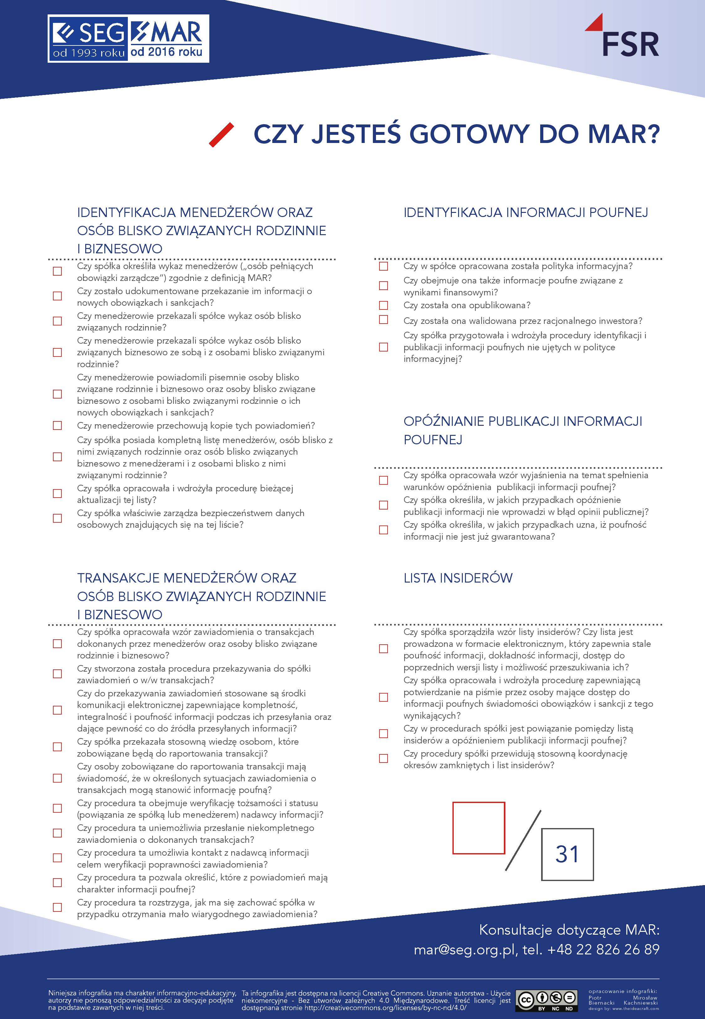 Stowarzyszenie Emitentów Giełdowych razem z Fundacją Standardów Raportowania przygotowało infografikę – checklistę, która pozwala spółce sprawdzić, czy jest przygotowana na nowe wymogi prawne. Lista składa się z 31 pytań z pięciu obszarów tematycznych: „Identyfikacja menedżerów oraz osób blisko związanych rodzinnie i biznesowo”; „Identyfikacja informacji poufnej”; „Transakcje menedżerów oraz osób blisko związanych rodzinnie i biznesowo”; „Opóźnianie informacji poufnej”; „Lista insiderów”.