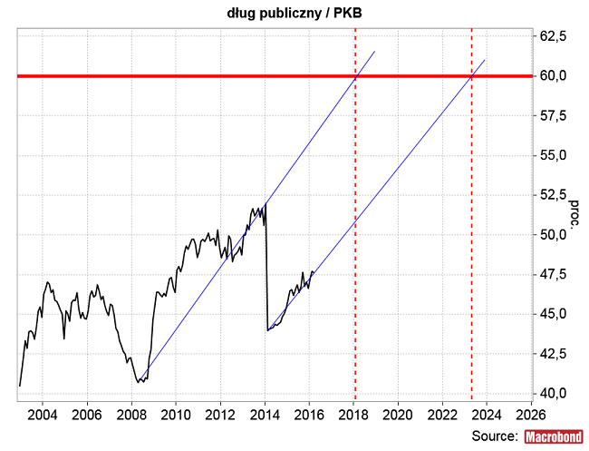 Ponieważ w polskiej Konstytucji znajduje się zapis zabraniający przekraczania przez relację długu publicznego do PKB poziomu 60 proc., to łatwo można wyliczyć, że gdyby tendencje - zarówno jeśli chodzi o dług jak i PKB - obserwowane od lutego 2014 były kontynuowane, to bariera ta zostanie przekroczona za 7 lat gdzieś w okolicach drugiej połowy 2023 roku. Poziom z początku 2014 roku - sprzed konfiskaty oszczędności emerytalnych - osiągnięty zostanie w okolicach drugiej połowy 2018 roku.