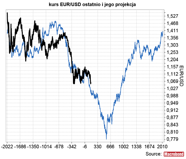 Zacznijmy od porównania zachowania dolara względem euro i jena do projekcji przedstawionych w połowie września. Zgodnie z projekcją euro miało dosyć jednostajnie słabnąć względem dolara i rzeczywiście od połowy września do końca listopada kurs EUR/USD spadł z 1,12 do 1,05, chociaż i tak nie dogonił spadającej jeszcze szybciej projekcji.