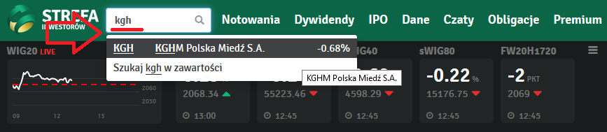 Widok 1: Widok profilu KGHM, w serwisie Strefa Inwestorów.