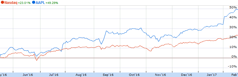 W akcjonariacie Apple firma Buffetta ujawniła się w połowie maja 2016 roku. Od tamtej pory cena akcji technologicznego giganta wzrosła o 49 proc. Walor zachowuje się o wiele lepiej, niż indeks technologiczny Nasdaq.