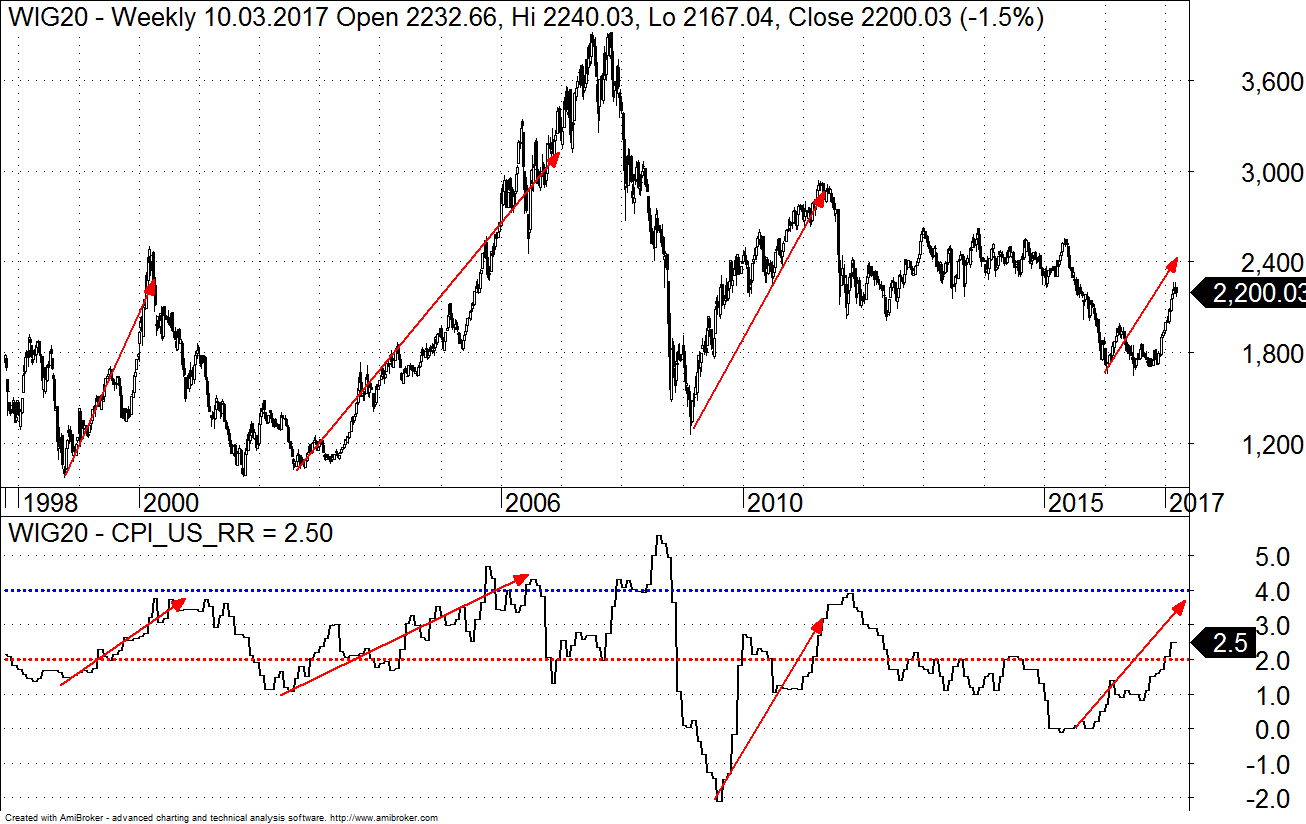Wszystkim hossom na WIG20 towarzyszył wzrost inflacji w USA. Oczywiście kurs indeksu reagował szybciej, ale począwszy od 1998 roku każdej hossie na polskiej giełdzie towarzyszyła inflacja w Stanach Zjednoczonych. Nie inaczej jest obecnie, gdzie równolegle do WIG20 rośnie inflacja CPI w USA, która już przekroczyła cel inflacyjny FED wynoszący 2% (czerwona przerywana linia).