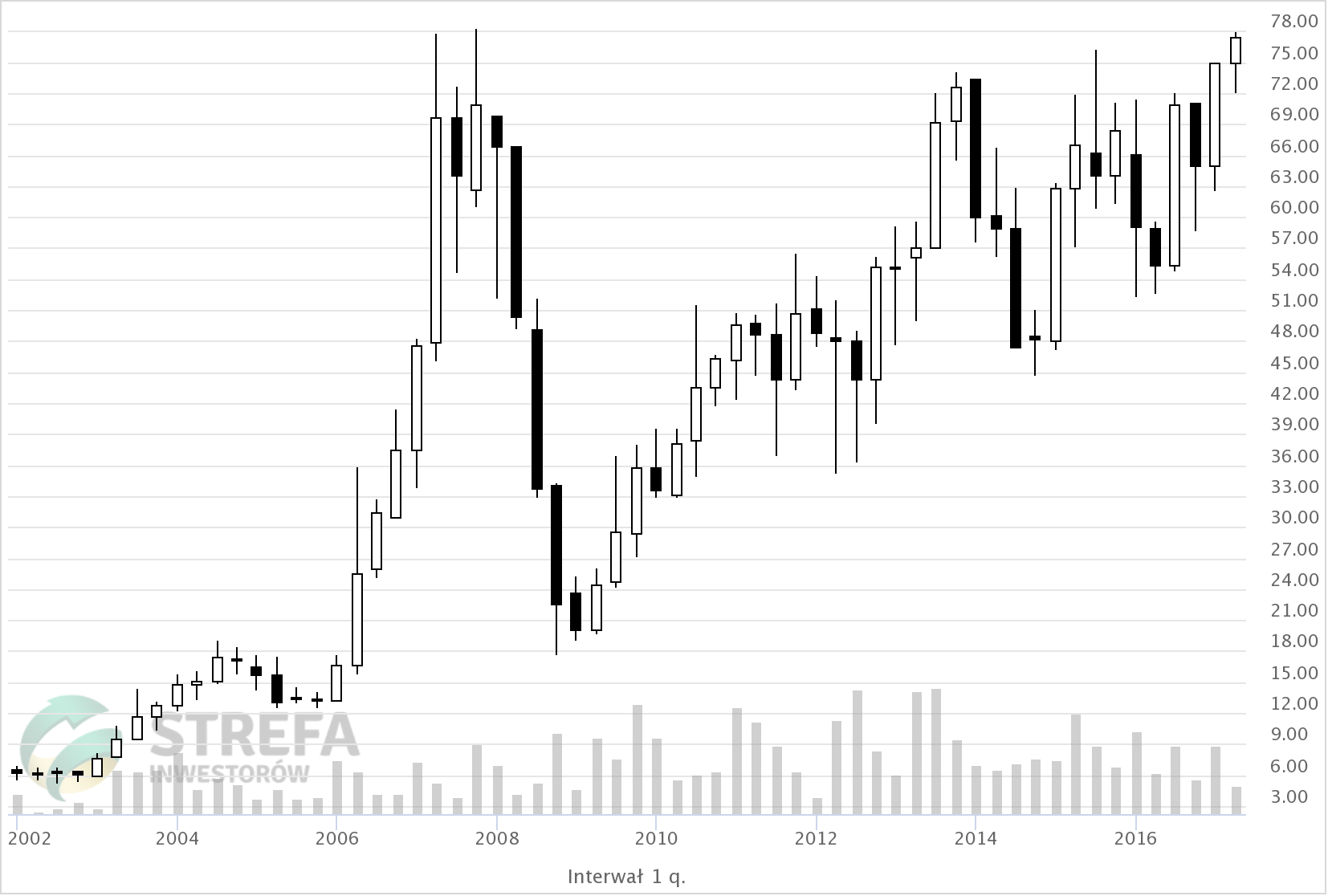 Ale mało tego: Emperia myśli o akwizycjach. No i pokazuje satysfakcjonujące wyniki finansowe. Nic dziwnego, że kilka sesji temu kurs spółki wyszedł ponad 76,84 zł, czyli na historyczne maksima.