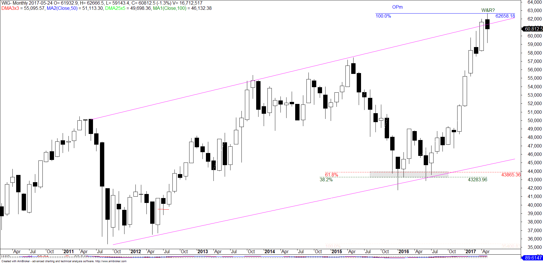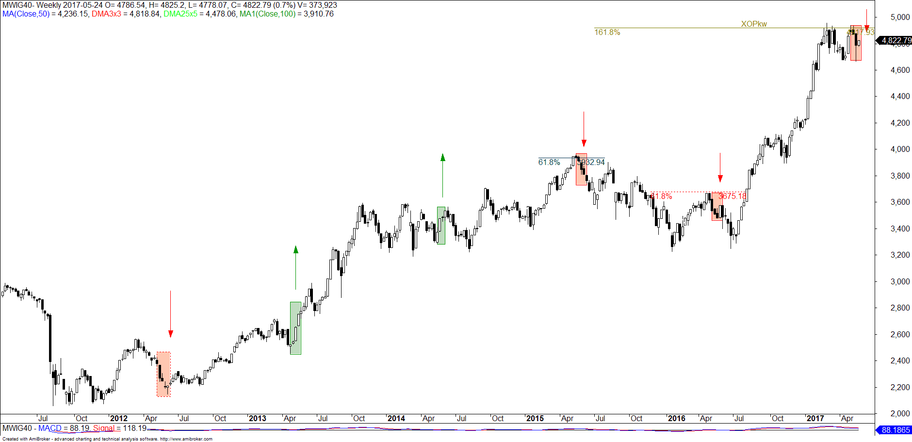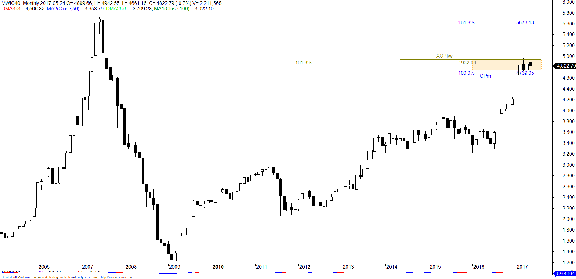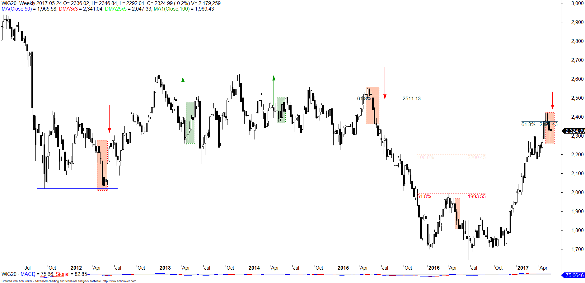 I tak - w 2012 roku maj zakończył falę spadkową na wsparciu, co rokowało rozpoczęcie trendu wzrostowego – i tak rzeczywiście się stało. W maju 2015 - po dojściu do oporu rozpoczął się dynamiczny impuls spadkowy i w następnych miesiącach mieliśmy kontynuację spadków. Z kolei w zeszłym roku maj wpisał się w trwającą falę spadkową i kolejne miesiące przyniosły jej kontynuację. Aktualnie indeksy po dojściu do oporu kończą maj pod kreską.