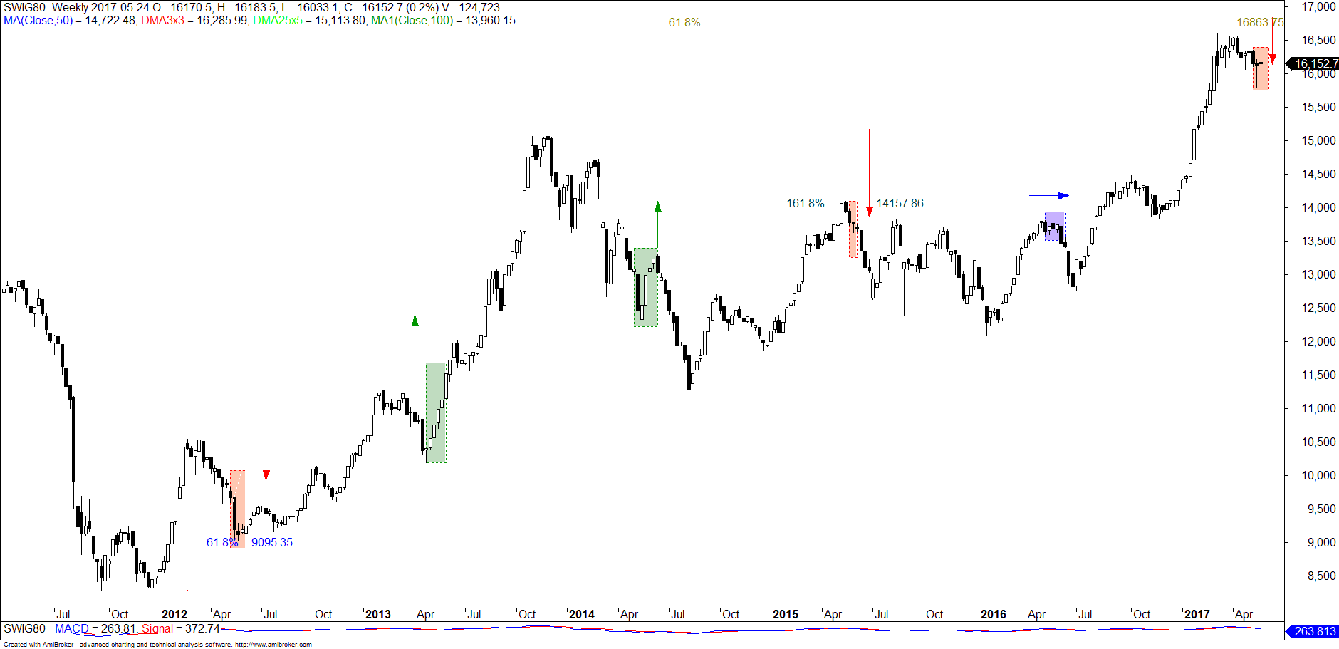 Na indeksach małych i średnich spółek, stosunek majowych miesięcy wzrostowych do spadkowych jest podobny i ma analogiczne znaczenie. Wyjątkiem jest maj 2016 roku, który dla SWIG80 zakończył się neutralnie - w konsolidacji, ponieważ był on w tym okresie relatywnie najsilniejszy.