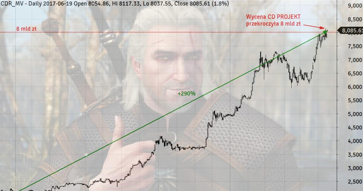 W trakcie sesji we wtorek 13 czerwca wartość rynkowa CD Projekt po raz pierwszy w historii przekroczyła 8 mld zł. Następnego dnia kapitalizacja spółki osiągnęła nawet poziom 8,16 mld zł.