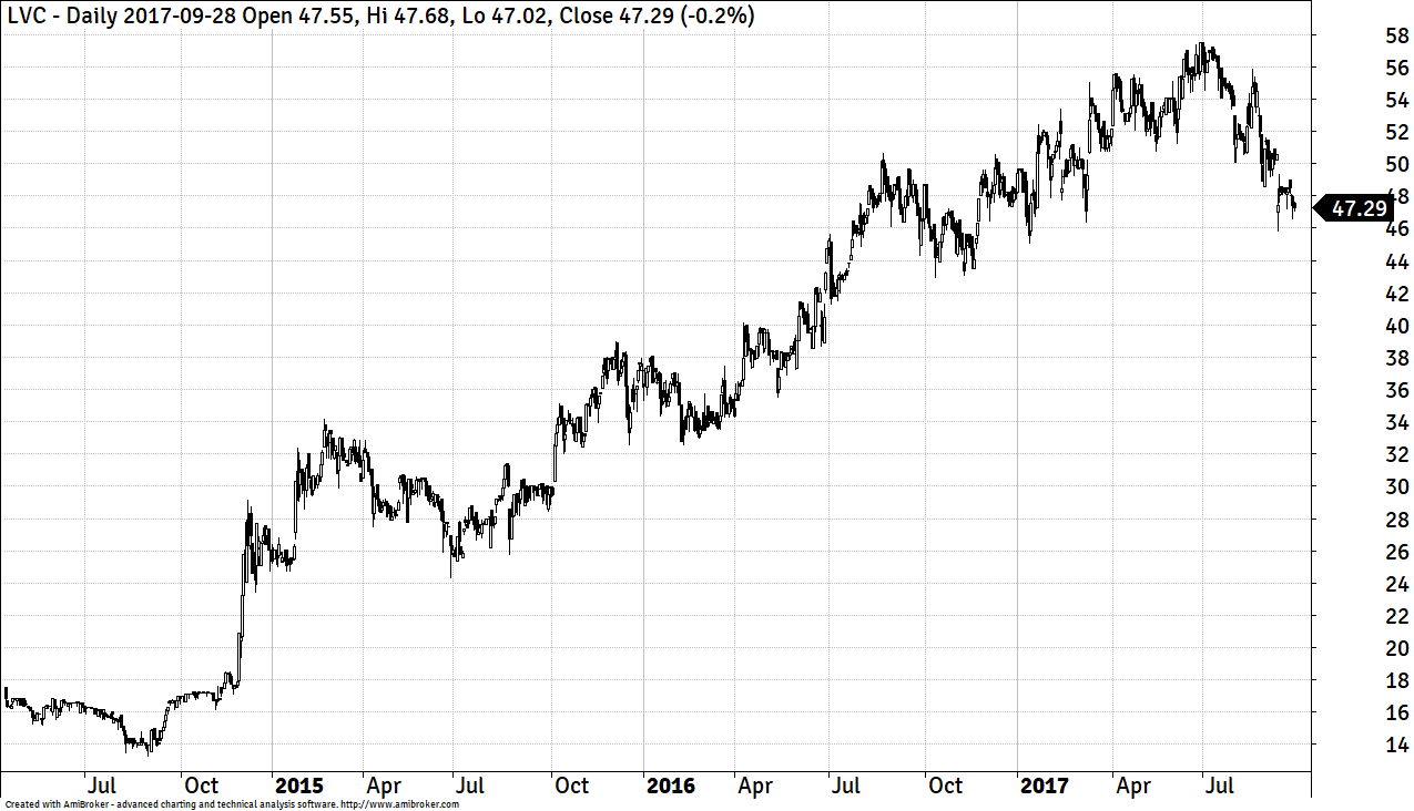 Wykres nr 1. Kurs akcji LiveChat Software od debiutu w 2014 roku