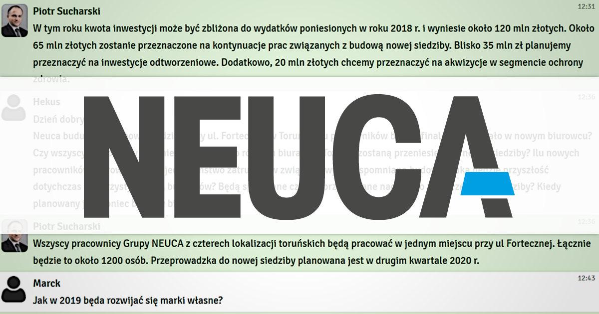 We wtorek, 29 stycznia 2019 r. odbył się czat inwestorski z Piotrem Sucharskim, Prezesem Zarządu Grupy Kapitałowej NEUCA. W czasie spotkania rozmawialiśmy o perspektywach rozwoju w branży ochrony zdrowia w 2019 roku, zmianach rynkowych i prawnych, sytuacji finansowej spółki, inwestycjach w innowacje oraz dalszej polityce dywidendowej. W spotkaniu, które cieszyło się dużą popularnością, wzięło udział blisko 630 inwestorów. Prezes spółki odpowiedział na 20 pytań. Zapraszamy do lektury całej relacji z czatu.