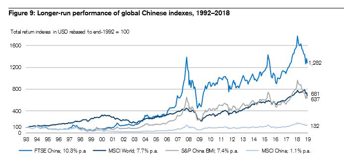 Poza tym trzeba mieć sporo szczęścia, żeby porządnie zarobić na inwestycji na rynku chińskim. Duże różnice są nawet jeśli chodzi o zachowanie się poszczególnych indeksów z ekspozycją na tamtejszy rynek akcji. Od 1993 roku średniorocznie na inwestycji w indeks FTSE China można było zyskać 10,3%, ale na inwestycji w MSCI China tylko 1,1%. W tym okresie indeks MSCI World rósł średniorocznie o 7,7%.