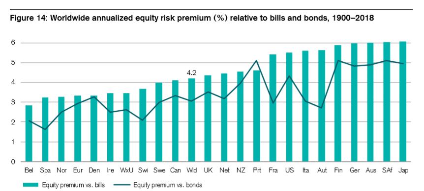 Ciekawy jest też wykres prezentujący zannualizowaną premię za ryzyko na poszczególnych rynkach akcji, w relacji do obligacji i bonów skarbowych.