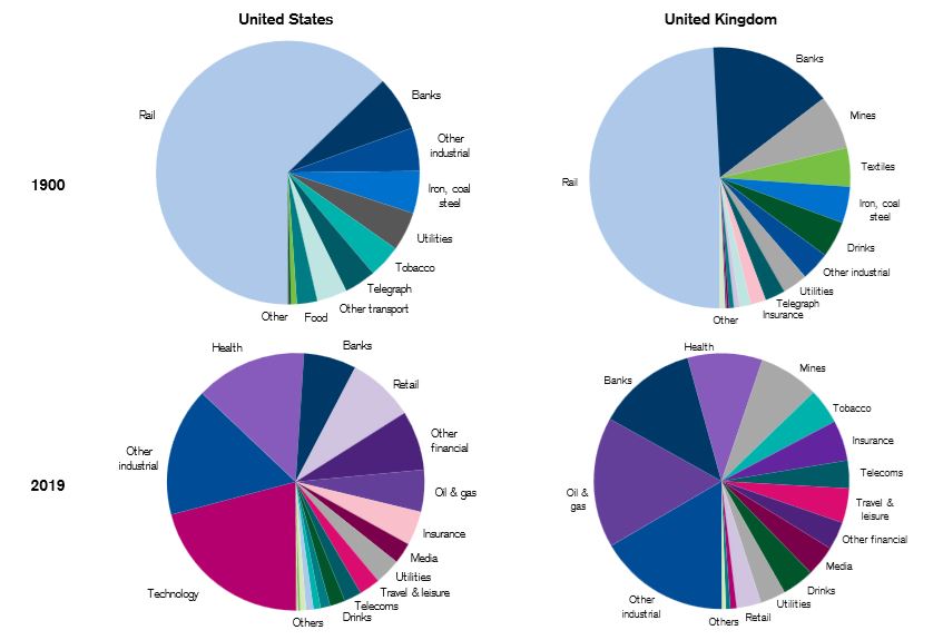 Skład sektorowy indeksów amerykańskiego i brytyjskiego w latach 1900 i 2019