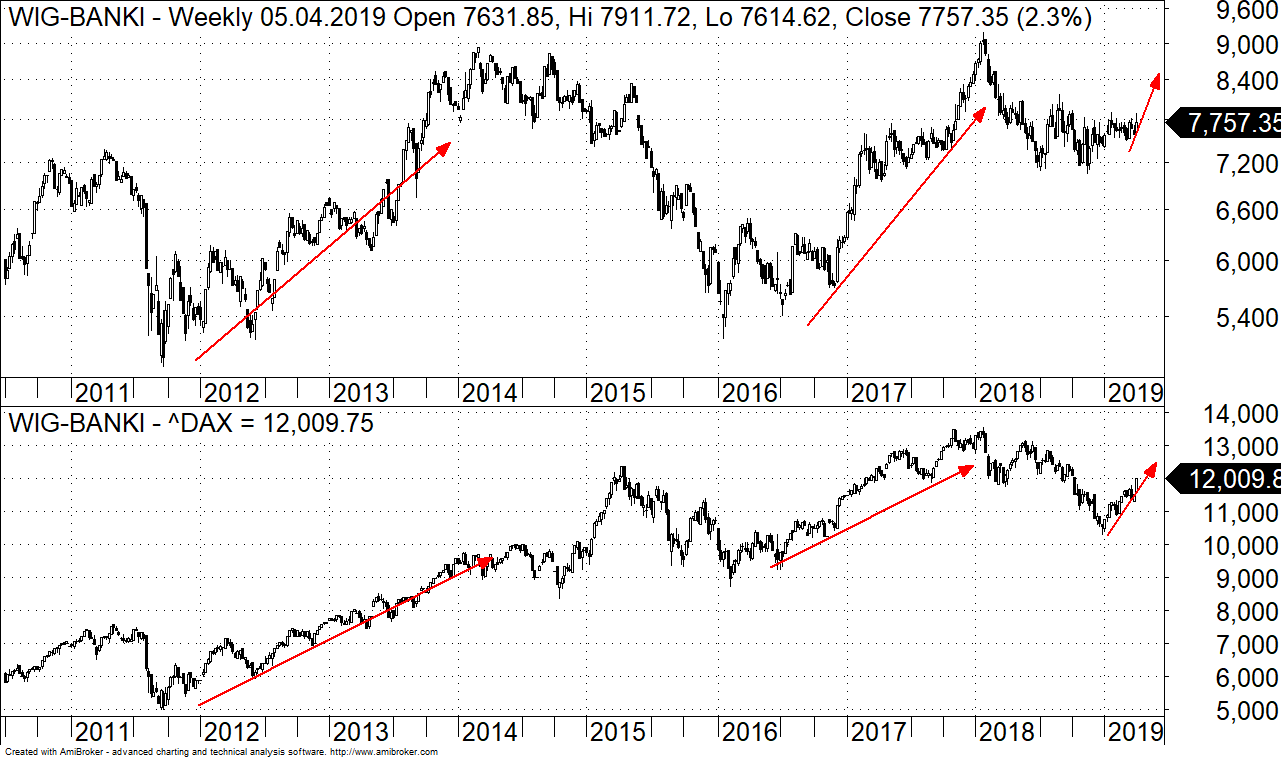 Po słabym 2018, od początku tego roku inwestorzy znowu kupują niemieckie akcje. Najważniejszy indeks tamtejszej giełdy DAX zyskał w 2019 roku na wartości już ponad 13%. To oznacza, że inwestorzy dyskontują fakt, że gospodarka Niemiec powoli wychodzi z okresu spowolnienia. To może oznaczać, że indeks giełdy niemieckiej może znowu wejść w trend wzrostowy i wyjść docelowo na historyczne maksima. W przeszłości, równolegle do wzrostów na indeksie DAX zyskiwał szybko na wartości WIG-banki. Ożywienie w gospodarce naszego najważniejszego partnera handlowego oznacza bowiem ożywienie gospodarcze w polskiej gospodarcze na czym mocno zyskują banki.