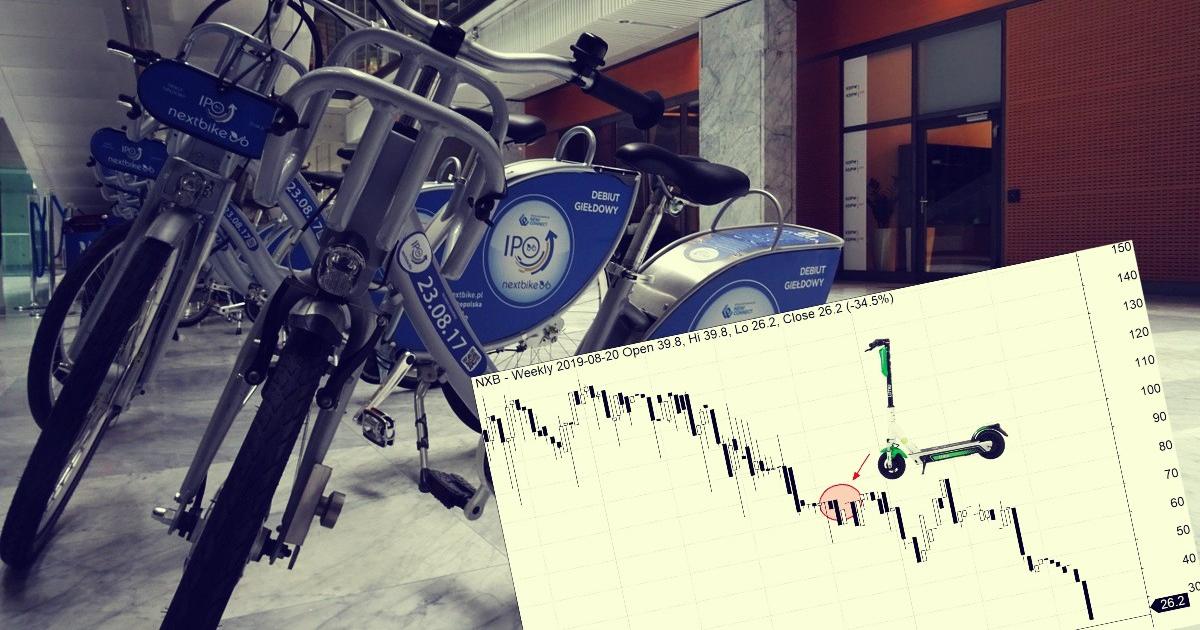 Spółka Nextbike - oferująca usługę roweru miejskiego - rozwija się dynamicznie, ale pokazuje słabe wyniki. Kurs jej akcji leci na łeb, na szyję. Wyceniana jeszcze w 2017 roku na 140 mln zł spółka dzisiaj jest warta zaledwie 28 mln zł. Przyczyn tego zjawiska jest jak zawsze kilka, ale główną może być pojawienie się w polskich miastach elektrycznych hulajnóg.