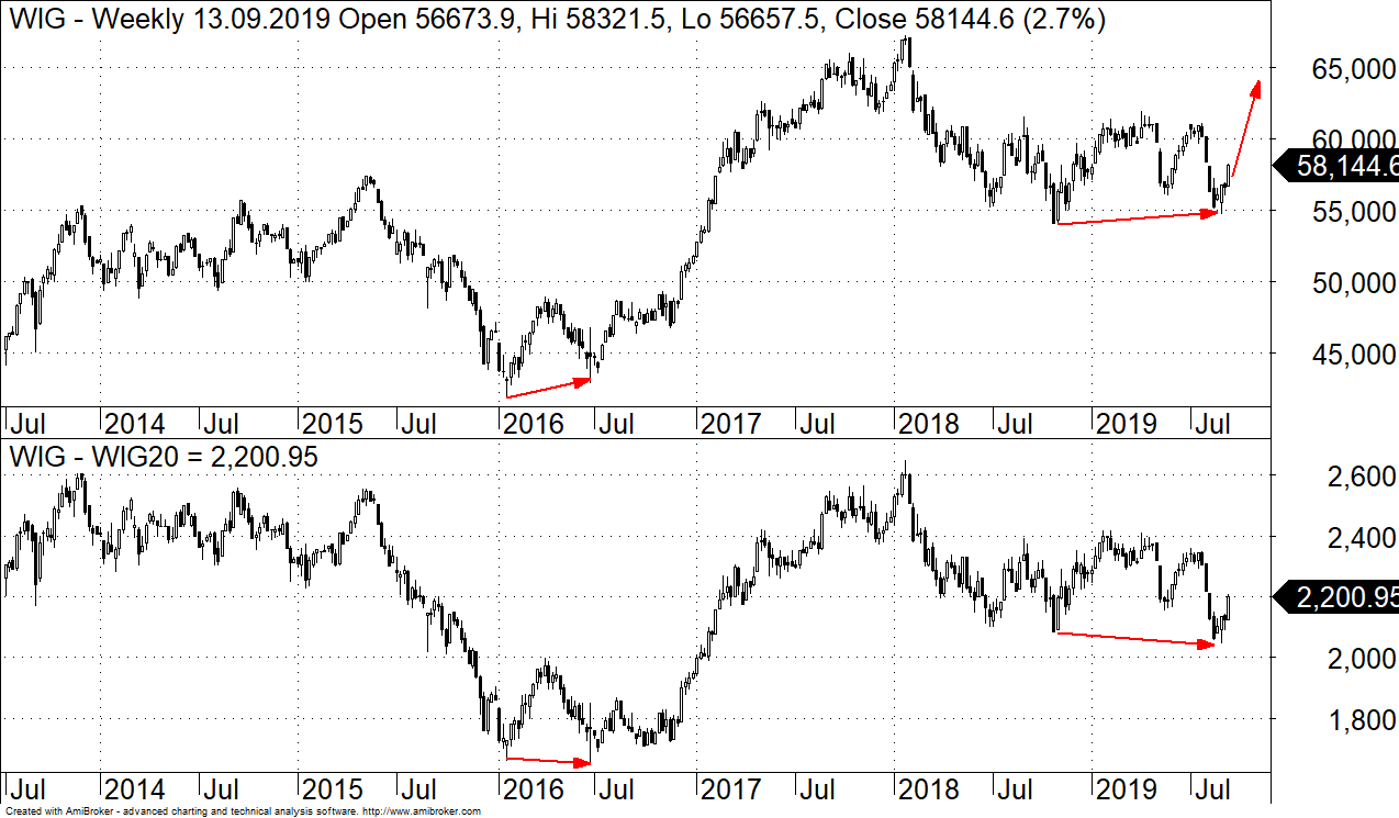 Tego samego rodzaju sytuacja rynkowa miała miejsce w 2012 roku. Wtedy również po przecenie wywołanej przez kryzys PIIGS indeks WIG wykazał się siłą, pomimo nowych rocznych minimów na WIG20. Szybko potem rozpoczął się dynamiczny ruch w górę.