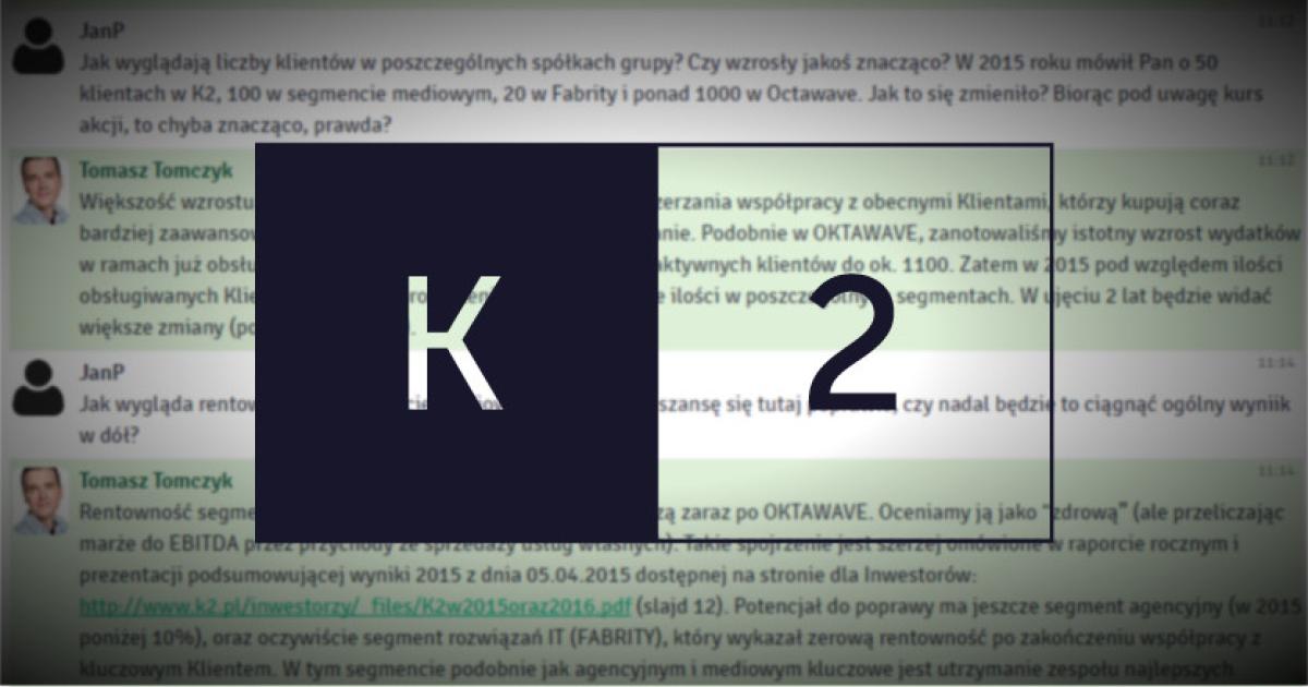 Zapis historii czatu z prezesem K2 Internet, Tomaszem Tomczykiem, który odbył się 6 kwietnia 2016 r.