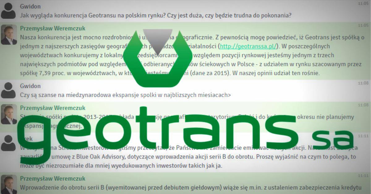 W poniedziałek, 29 sierpnia 2016 r. spotkaliśmy się z prezesem spółki, Przemysławem Weremczukiem, aby zorganizować czat inwestorski. W spotkaniu wzięło udział w sumie blisko 200 osób. W czasie godziny prezes odpowiedział na 20 pytań. Cieszymy się, że spółka w swojej strategii budowania relacji z rynkiem stara się dotrzeć do inwestorów indywidualnych i zdecydowała się na taką formę komunikacji. Zapraszamy do lektury zapisu całego czatu inwestorskiego Geotrans.