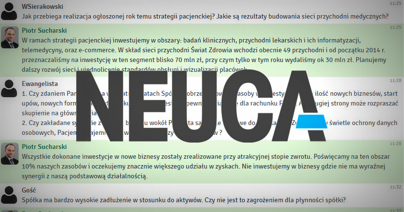 W środę, 21 grudnia 2016 r. spotkaliśmy się z prezesem spółki NEUCA, Piotrem Sucharskim, aby zorganizować czat inwestorski. W spotkaniu, które cieszyło się dużym zainteresowaniem, wzięło udział ponad 270 inwestorów. W trakcie nieco ponad półtorej godziny prezes odpowiedział na 25 pytań. Zapraszamy do lektury zapisu całego czatu inwestorskiego. Dowiecie się m.in. o aktualnej kondycji spółki, planach rozwoju, polityce dywidendowej i inwestycjach w innowacje, które prowadzi NEUCA.