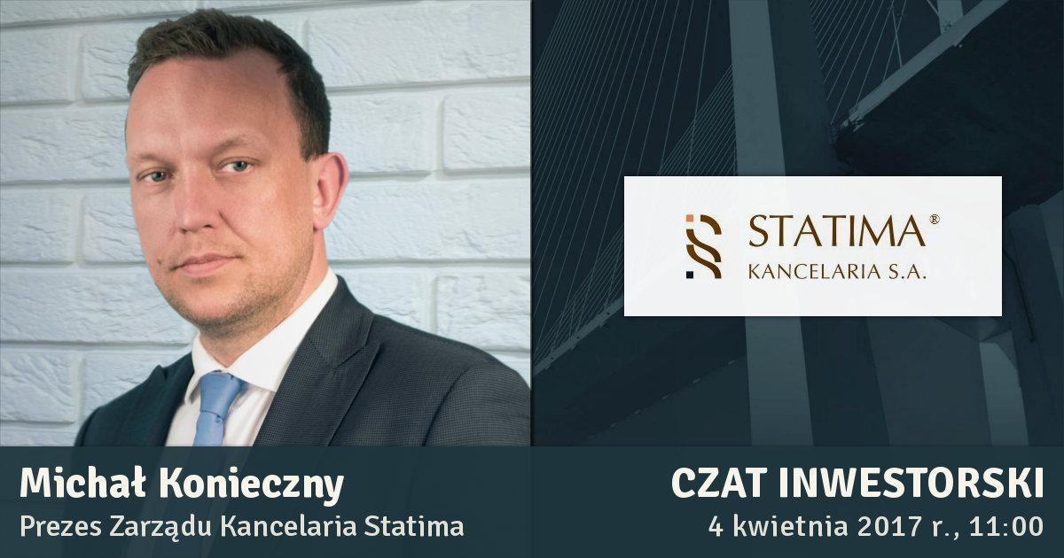 Zapraszamy na czat z Prezesem Zarządu Kancelarii Statima - Michałem Koniecznym, w trakcie którego nasz gość chętnie odpowie na wszystkie pytania dotyczące spółki, w tym: sytuacji finansowej, szczegółów związanych z emisją obligacji, z planowaną ekspansją zagraniczną i akwizycjami oraz rozważanym debiutem na głównym parkiecie warszawskiej giełdy.
