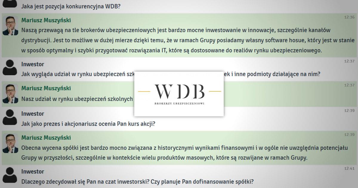 W czwartek, 6 lipca 2017 r., spotkaliśmy się z Mariuszem Muszyńskim, prezesem zarządu spółki WDB Brokerzy Ubezpieczeniowi, aby zorganizować czat inwestorski. W spotkaniu, które cieszyło się sporym zainteresowaniem wzięło udział ponad 360 inwestorów. Prezes odpowiedział na 43 pytania, poruszając w czasie dyskusji takie tematy jak bieżąca sytuacja spółki, plany rozwoju i prowadzone przez spółkę innowacyjne projekty na rynku ubezpieczeń dla klientów biznesowych i detalicznych. Zapraszamy do lektury zapisu całej dyskusji, jaka odbyła się w czasie czatu.