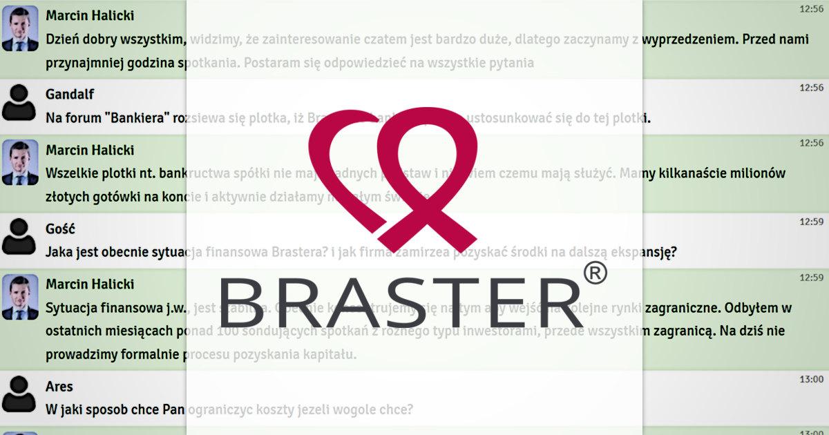W czwartek, 10 maja 2018 r. zorganizowaliśmy czat inwestorski z prezesem zarządu spółki Braster, Marcinem Halickim. W czasie dyskusji prezes odpowiadał na pytania dotyczące sytuacji finansowej spółki, jej wejścia na rynki zagraniczne, uzyskania certyfikacji przez FDA, nowej wersji urządzenia Braster – Braster Professional oraz dalszej strategii działania. W spotkaniu, które cieszyło się dużym zainteresowaniem, wzięło udział ponad 750 inwestorów. Przedstawiciel spółki odpowiedział na ponad 40 pytań. Zapraszamy do lektury całego zapisu czatu.