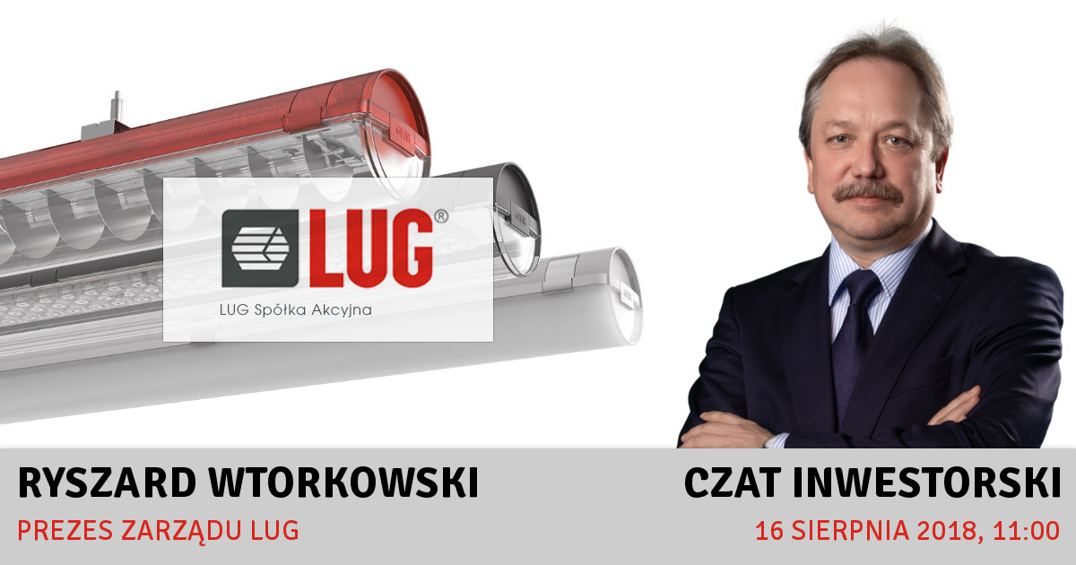 LUG to jeden z czołowych europejskich producentów profesjonalnych rozwiązań oświetleniowych. Grupa sprzedaje swoje produkty w Polsce oraz w kilkudziesięciu krajach na całym świecie. Spółka 16 sierpnia opublikuje wyniki za II kw. 2018 r. O aktualnej sytuacji finansowej grupy kapitałowej LUG, polityce dywidendowej, prowadzonych inwestycjach w Argentynie oraz kondycji branży oświetleniowej i jej głównych czynnikach rozwoju: smart lighting i smart city, będziemy rozmawiać z prezesem spółki, Ryszardem Wtorkowskim na czacie inwestorskim, który odbędzie się jeszcze tego samego dnia, w czwartek, 16 sierpnia 2018 r., o godz. 11:00.