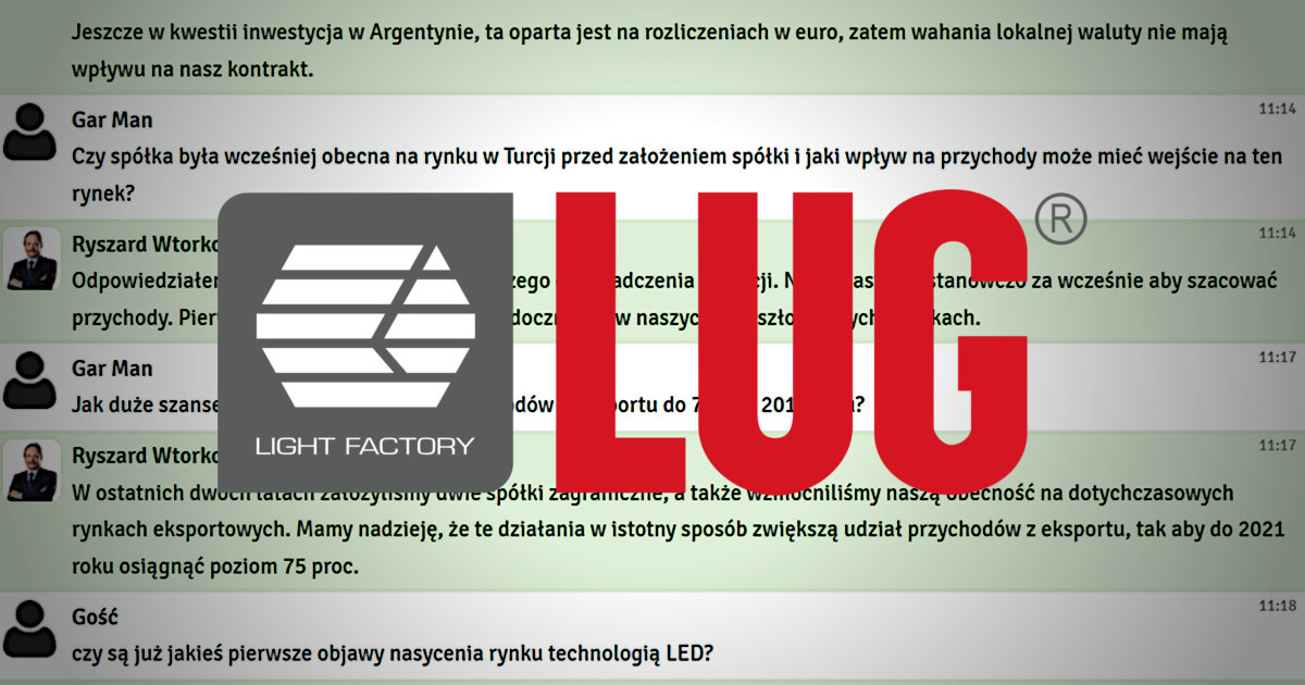 We czwartek, 16 sierpnia 2018 r. zorganizowaliśmy czat inwestorski z Prezesem Zarządu i głównym akcjonariuszem spółki LUG, Ryszardem Wtorkowskim. Dyskusja poświęcona była m.in. wynikom spółki za II kwartał 2018 r., aktualnej sytuacji finansowej grupy, polityce dywidendowej, prowadzonych inwestycjach w Argentynie i Turcji oraz kondycji branży oświetleniowej. W spotkaniu, które cieszyło się dużym zainteresowaniem wzięło udział blisko 500 inwestorów, a prezes spółki odpowiedział na 45 pytań. Zapraszamy do lektury całego zapisu czatu.