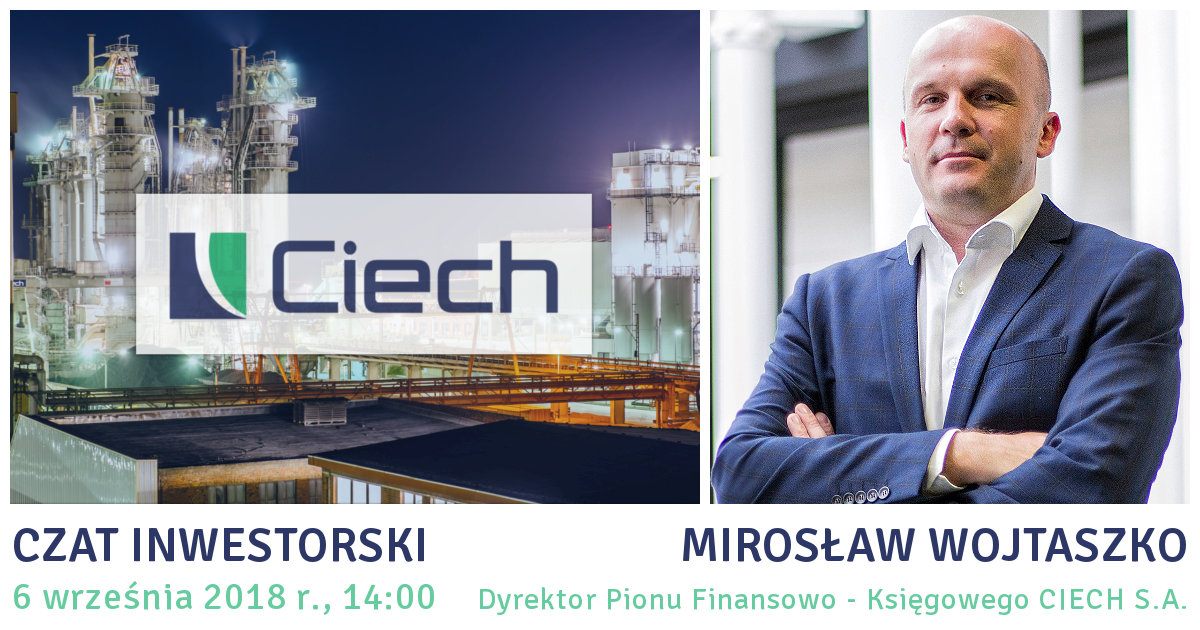 Już wkrótce, 5 września, spółka opublikuje wyniki finansowe za I półrocze 2018 r. Zapraszamy na czat inwestorski z Dyrektorem Pionu Finansowo-Księgowego w Grupie CIECH, Mirosławem Wojtaszko, na którym rozmawiać będziemy o aktualnej sytuacji finansowej spółki i planach dalszego rozwoju. Spotkanie odbędzie się w czwartek, 6 września 2018 r. o godz. 14:00. Zapraszamy do zadawania pytań już teraz.